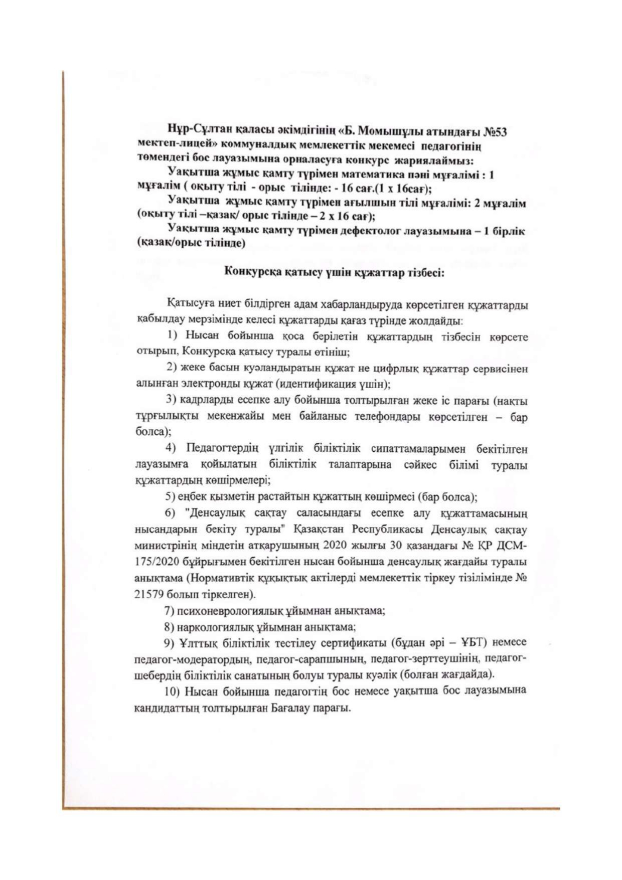 «Бауыржан Момышұлы атындағы №53 мектеп-лицей» КММ бос лауазымдық орнына орналасуға және (немесе) уақытша бос лауазымдық орынға конкурс өткізу туралы.31.08.2022.