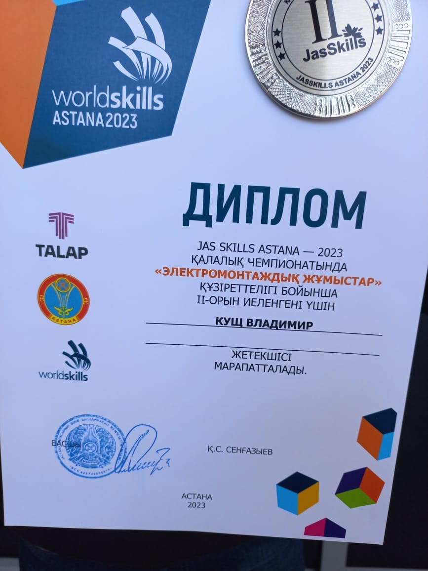Қалалық «Jass Skills ASTANA 2023» кәсіби шеберлік чемпионатында "Электромонтаждық жұмыстар" құзіреттілігі бойынша ІІ ОРЫН иеленгені үшін 9 Д сынып оқушысы Кущ Владимир және жетекшісі көркем еңбек пәні мұғалімі Байжанов Тасболат Сәбитұлын ҚҰТТЫҚТАЙМЫЗ! Астана қаласының Білім басқармасы/ Управление образования города Астаны "Астана дарыны" дарындылықты дамыту және психологиялық сүйемелдеу орталығы