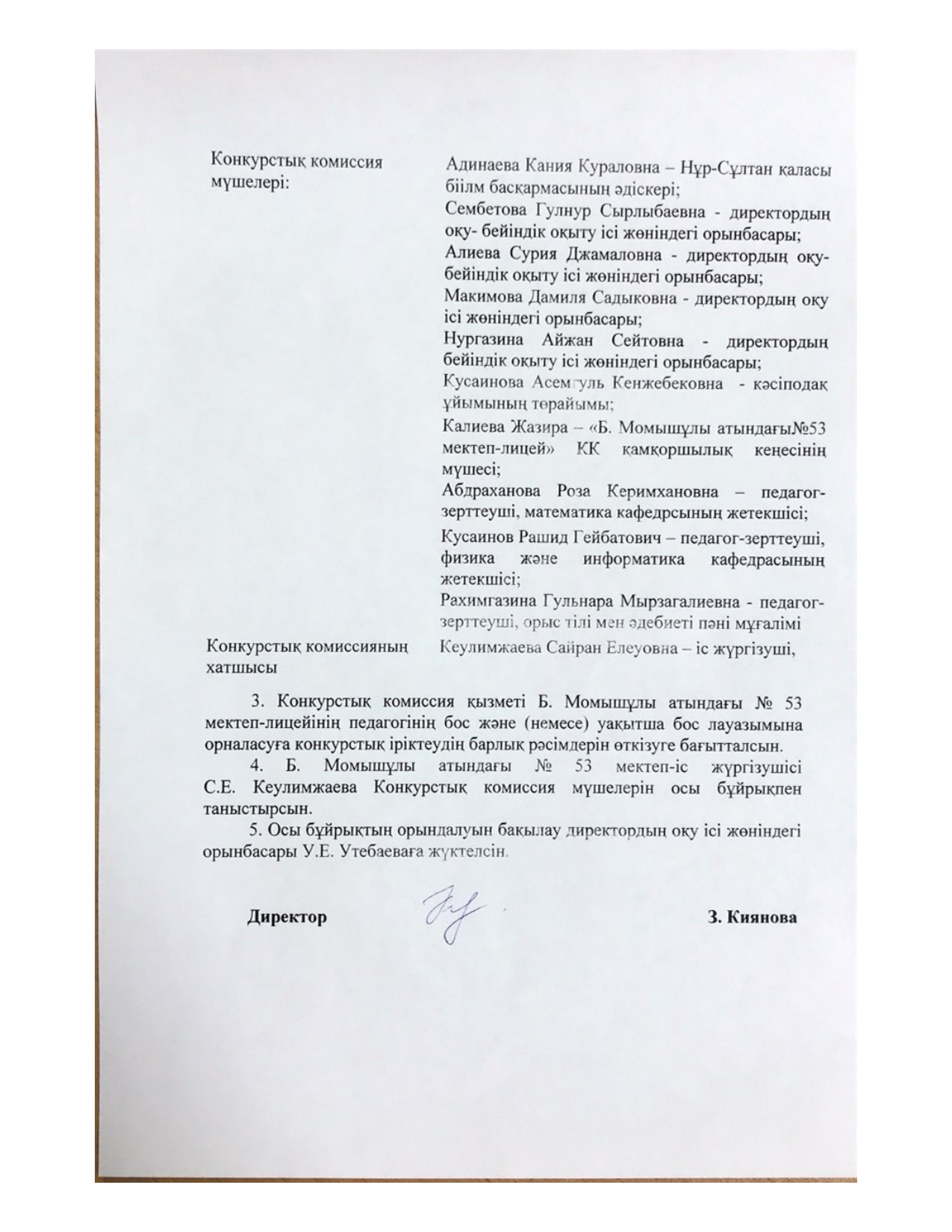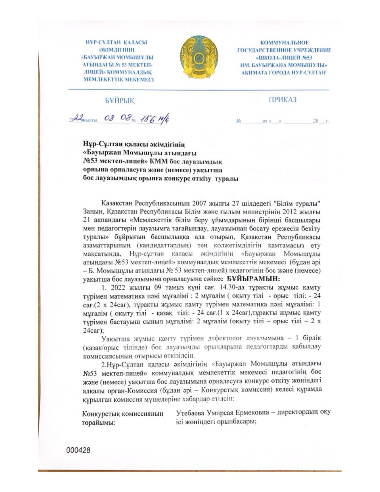 Нұр-Сұлтан қаласы әкімдігінің «Бауыржан Момышұлы атындағы №53 мектеп-лицей» КММ бос лауазымдық орнына орналасуға және (немесе) уақытша бос лауазымдық орынға конкурс өткізу туралы